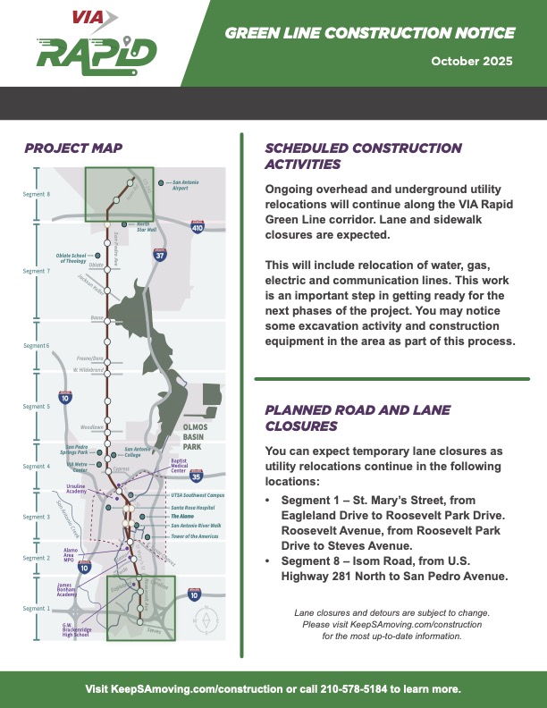Utility relocation work will begin during July 2025 in Segment 1 and Segment 8 of the VIA Rapid Green Line Project.