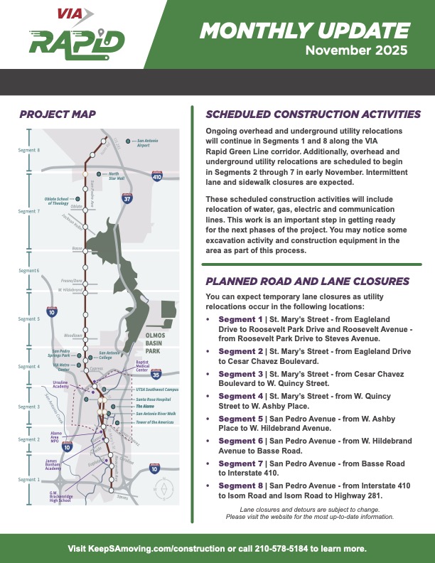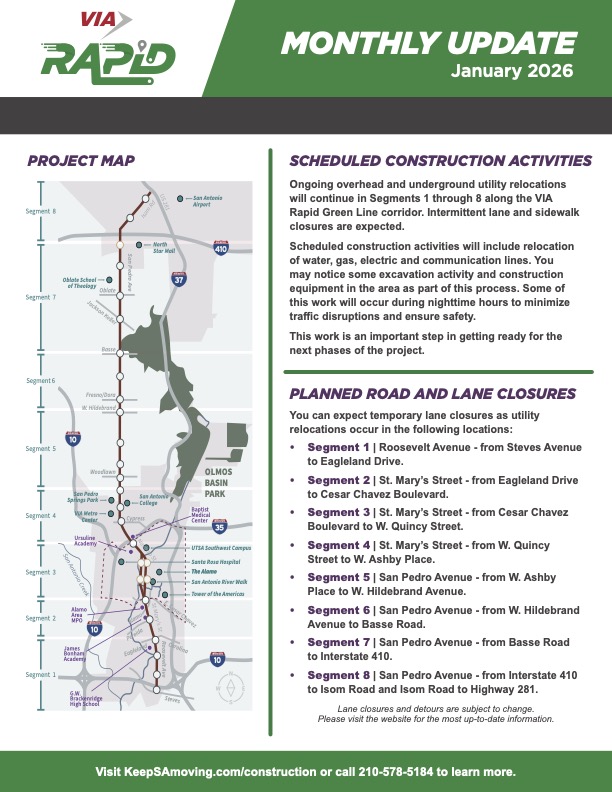 Overhead and underground utility relocations will continue across Segments 1 through 8 along the VIA Rapid Green Line corridor. Expect intermittent lane and sidewalk closures. Some of this work will occur during nighttime hours to minimize traffic disruptions and ensure safety. Motorists, cyclists, and pedestrians are encouraged to use caution in and around construction zones.